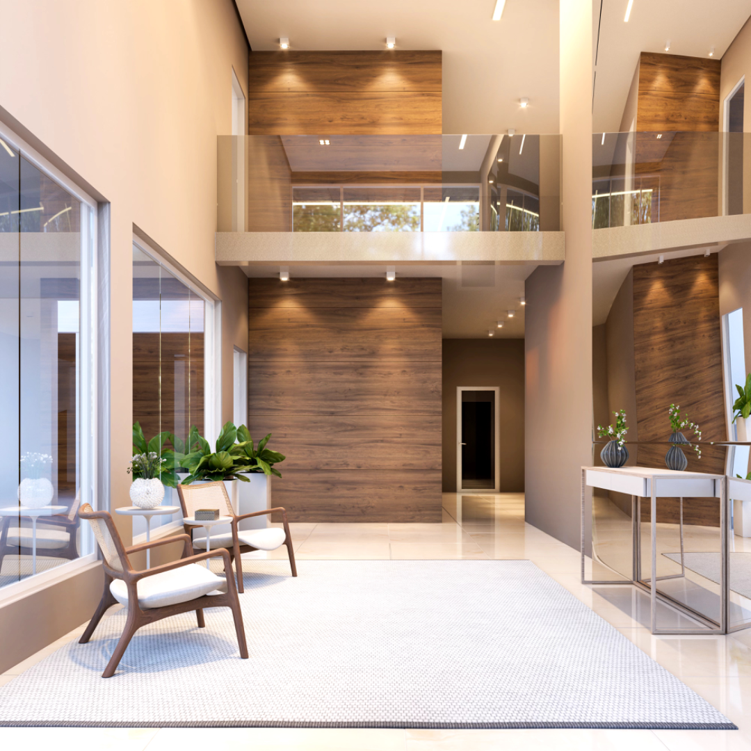 Cobertura duplex: O último andar é composto por quatro coberturas duplex, com 184,91 m² de área privativa, no primeiro pavimento terá sala de estar, sala de jantar, dois dormitórios, uma suíte, cozinha gourmet com churrasqueira, área de serviço e banheiro social. O andar superior contará com uma suíte máster com closet, mezanino e terraço com 21,54m². Três boxes por apartamento.