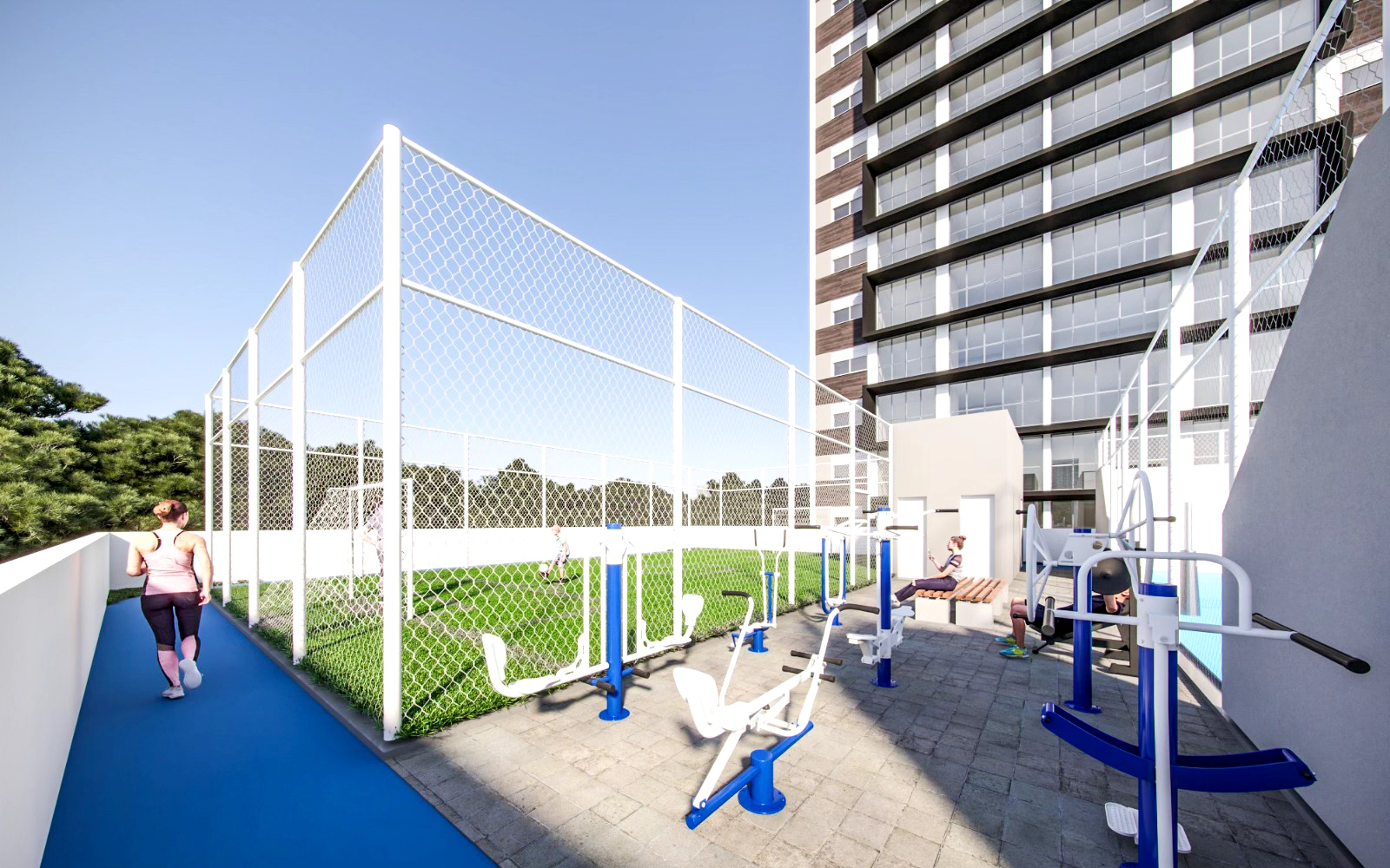 3º pavimento: Quadra poliesportiva, academia ao ar livre, lavabos, quadra de padel e pista de caminhada.