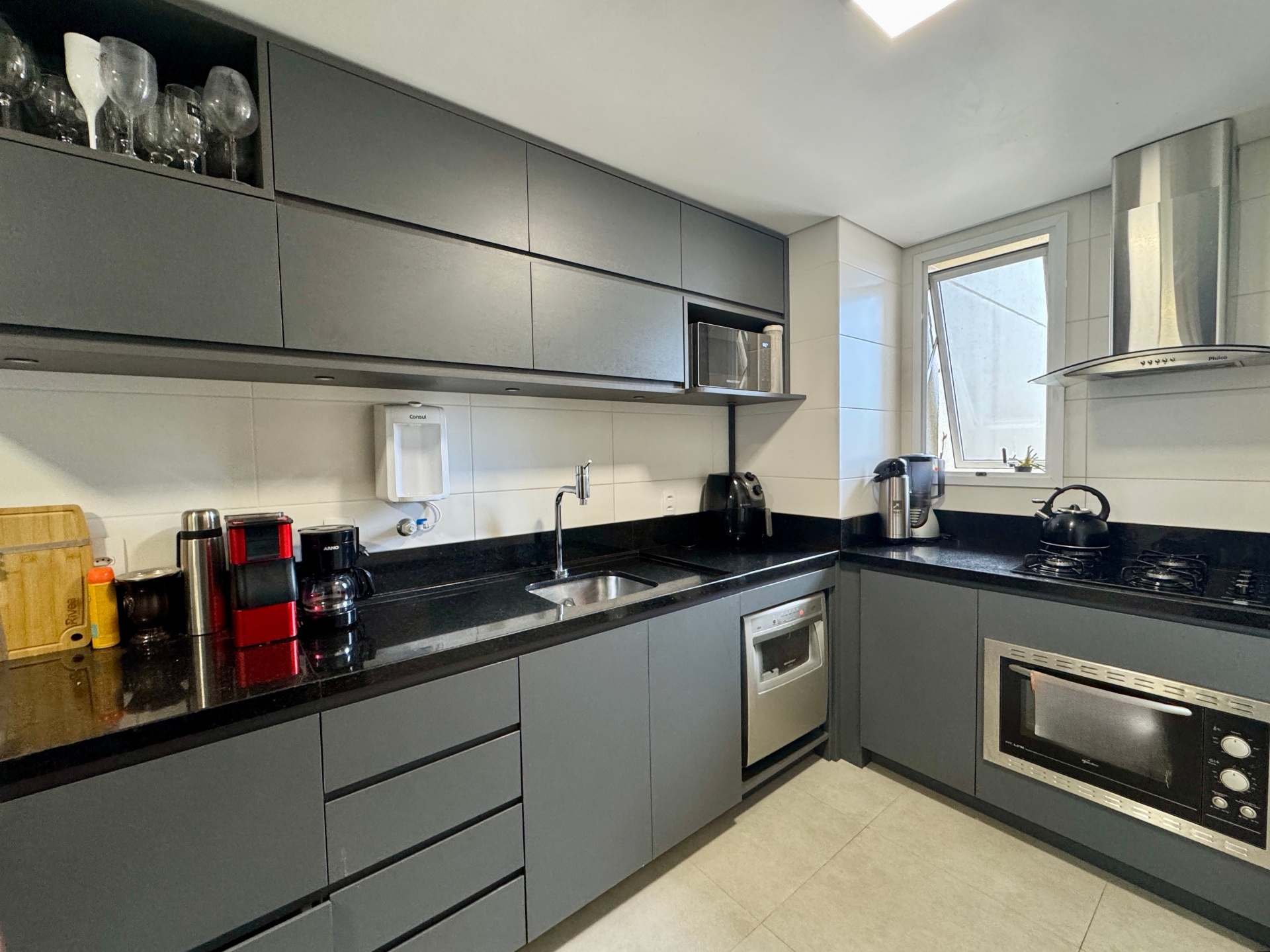Imóvel com 3 dormitórios, sendo 1 suíte, cozinha com churrasqueira integrada à sala de estar e jantar, banheiro social, lavanderia e duas vagas de garagem.