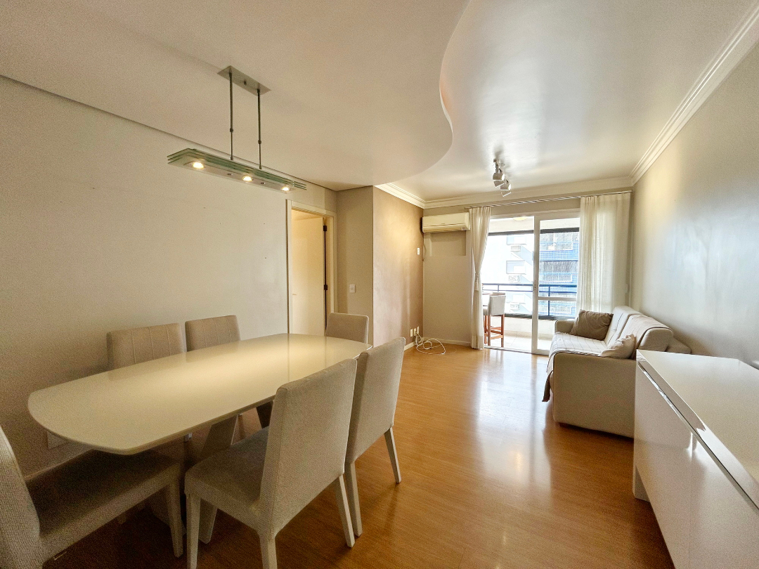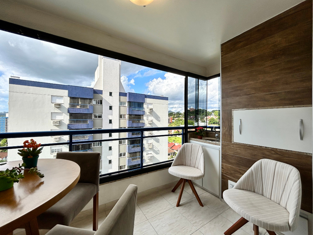 São 3 dormitórios, sendo um deles suíte, sacada com churrasqueira e esquadria reiki (abertura total), lavanderia separada e duas vagas de garagem lado a lado.