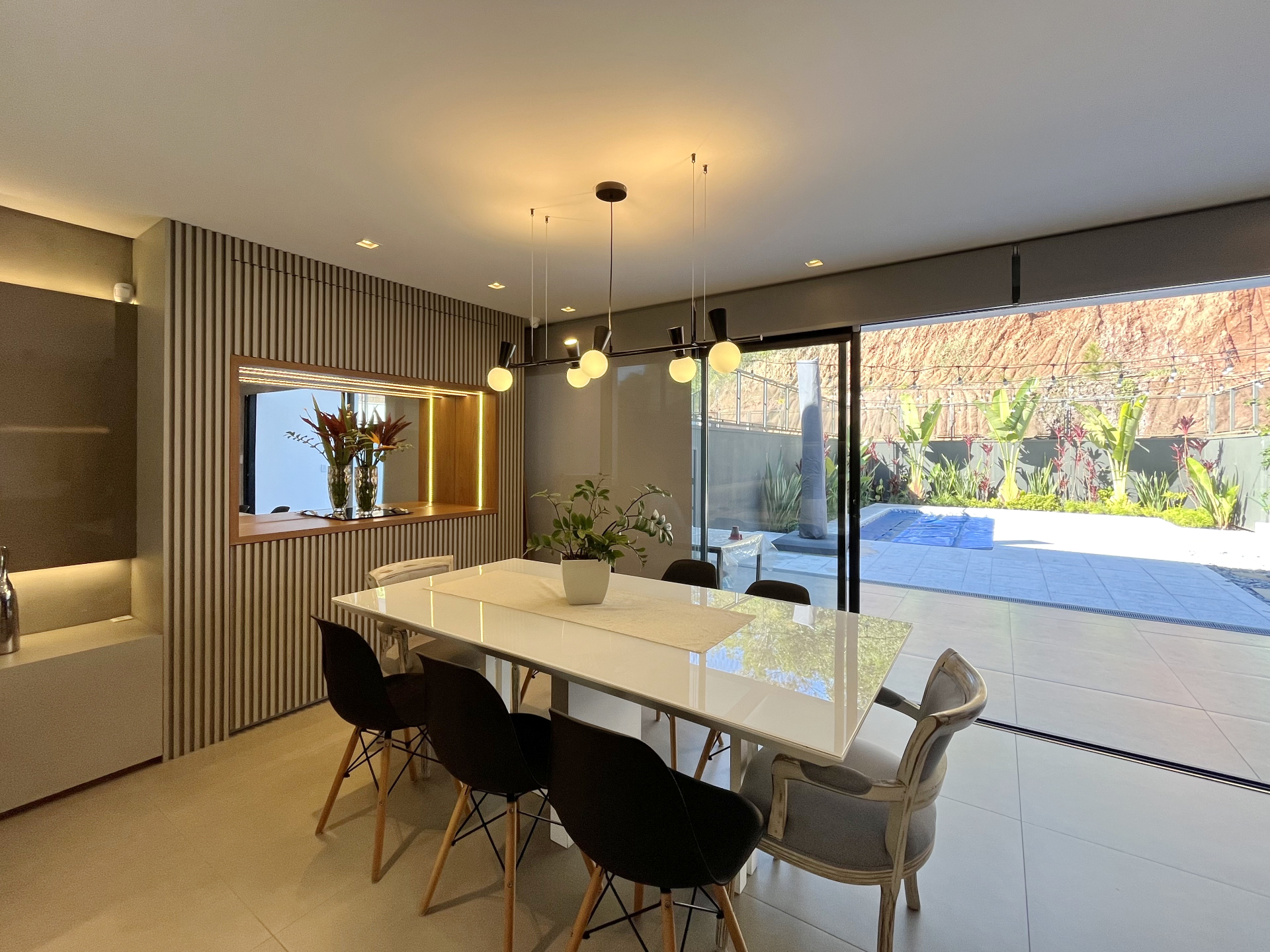 A área externa conta com uma piscina perfeita para os dias de sol, enquanto o projeto privilegia iluminação natural em todos os cômodos, criando ambientes arejados e aconchegantes.
