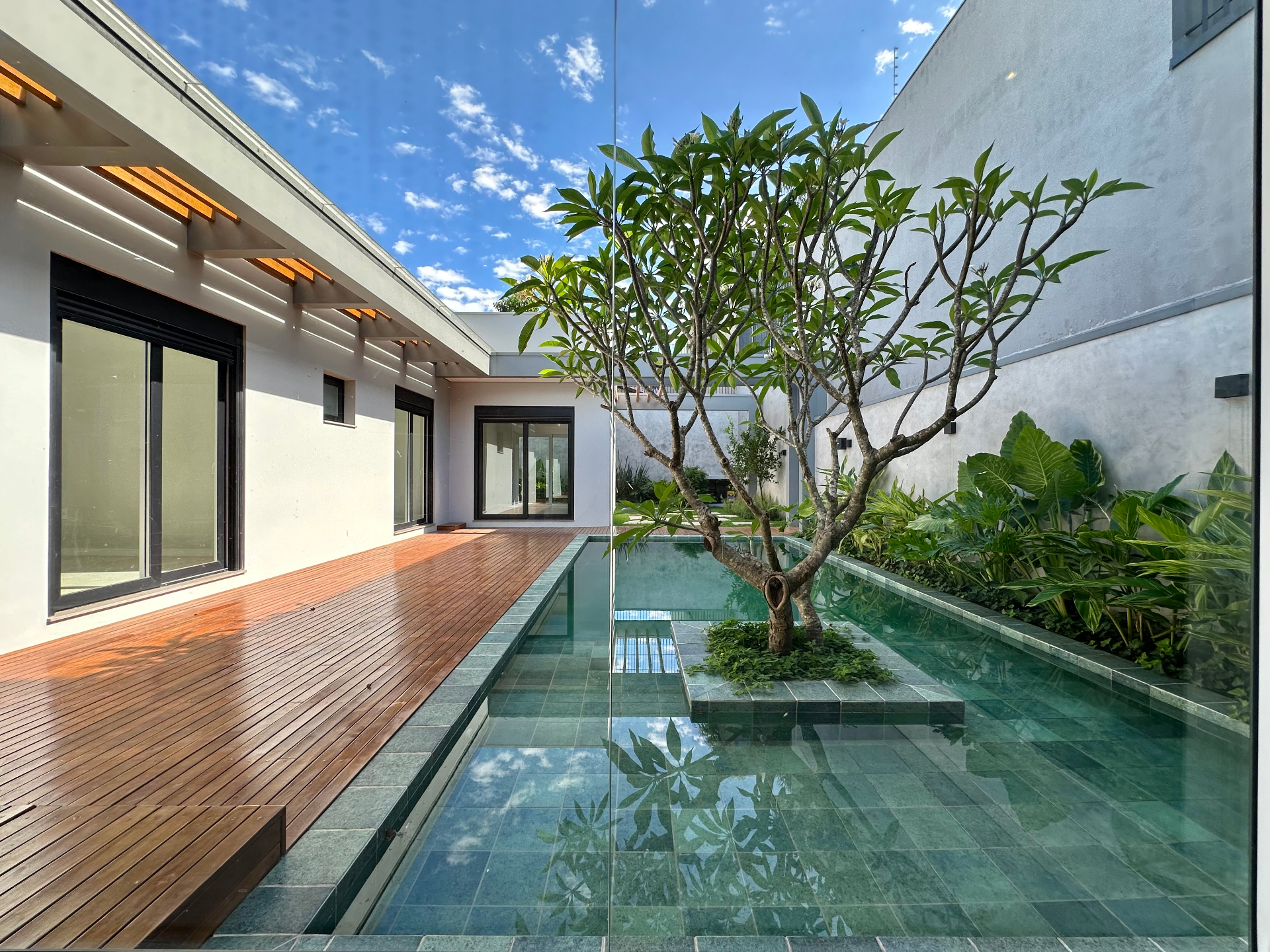A piscina é aquecida, energia solar, paisagismo, aberturas em PVC automatizadas, portão eletrônico para carros e portão com interfone para pedestres.
