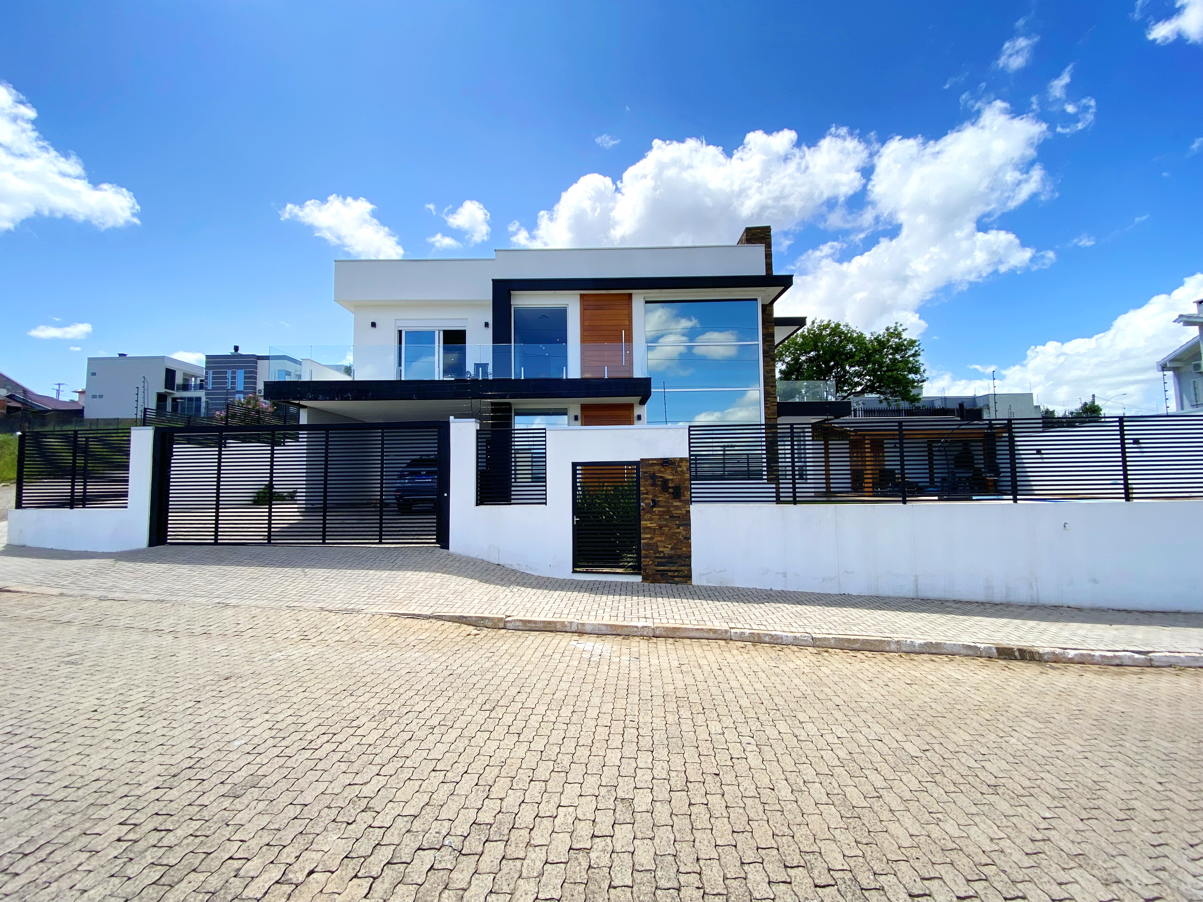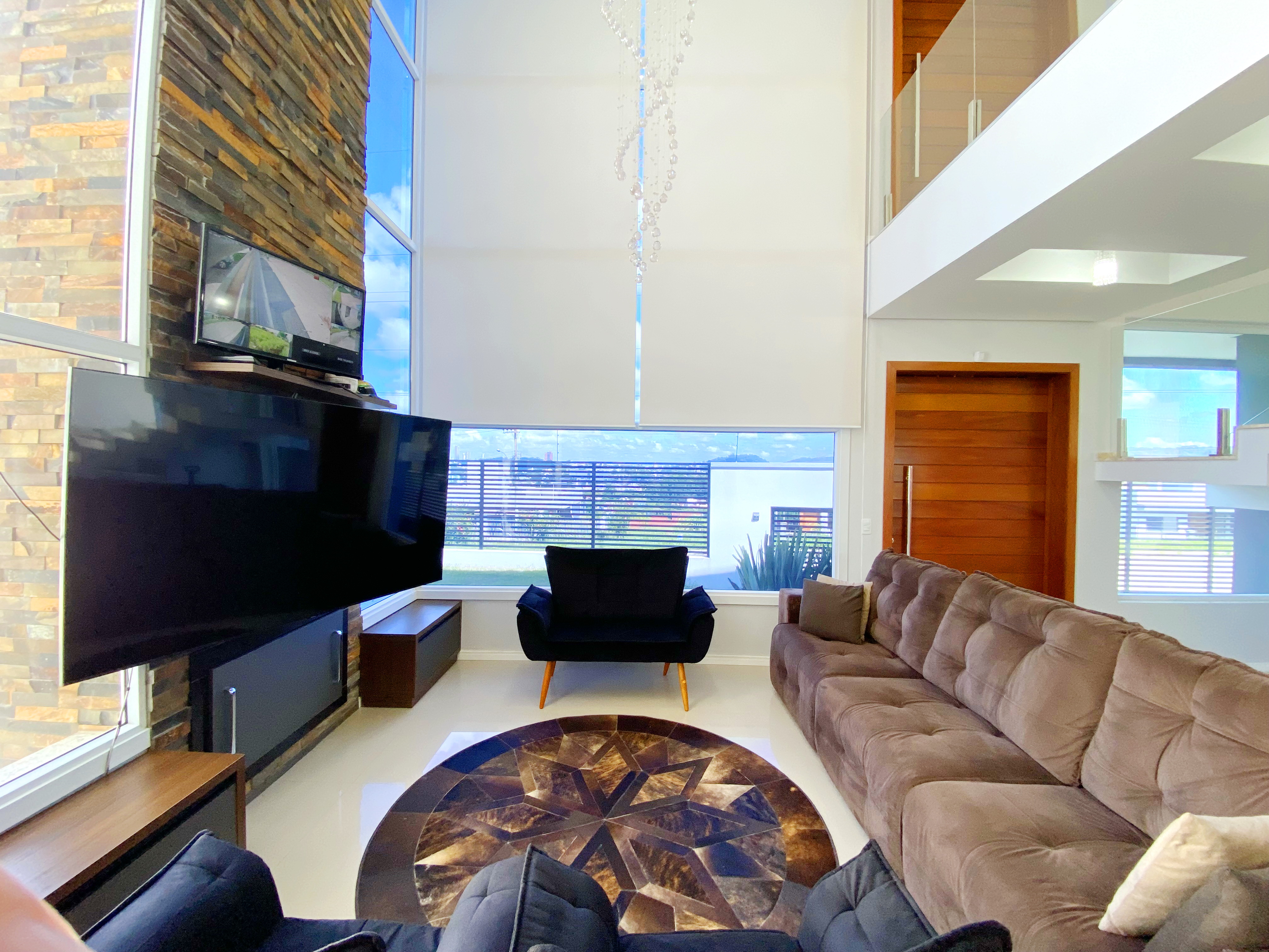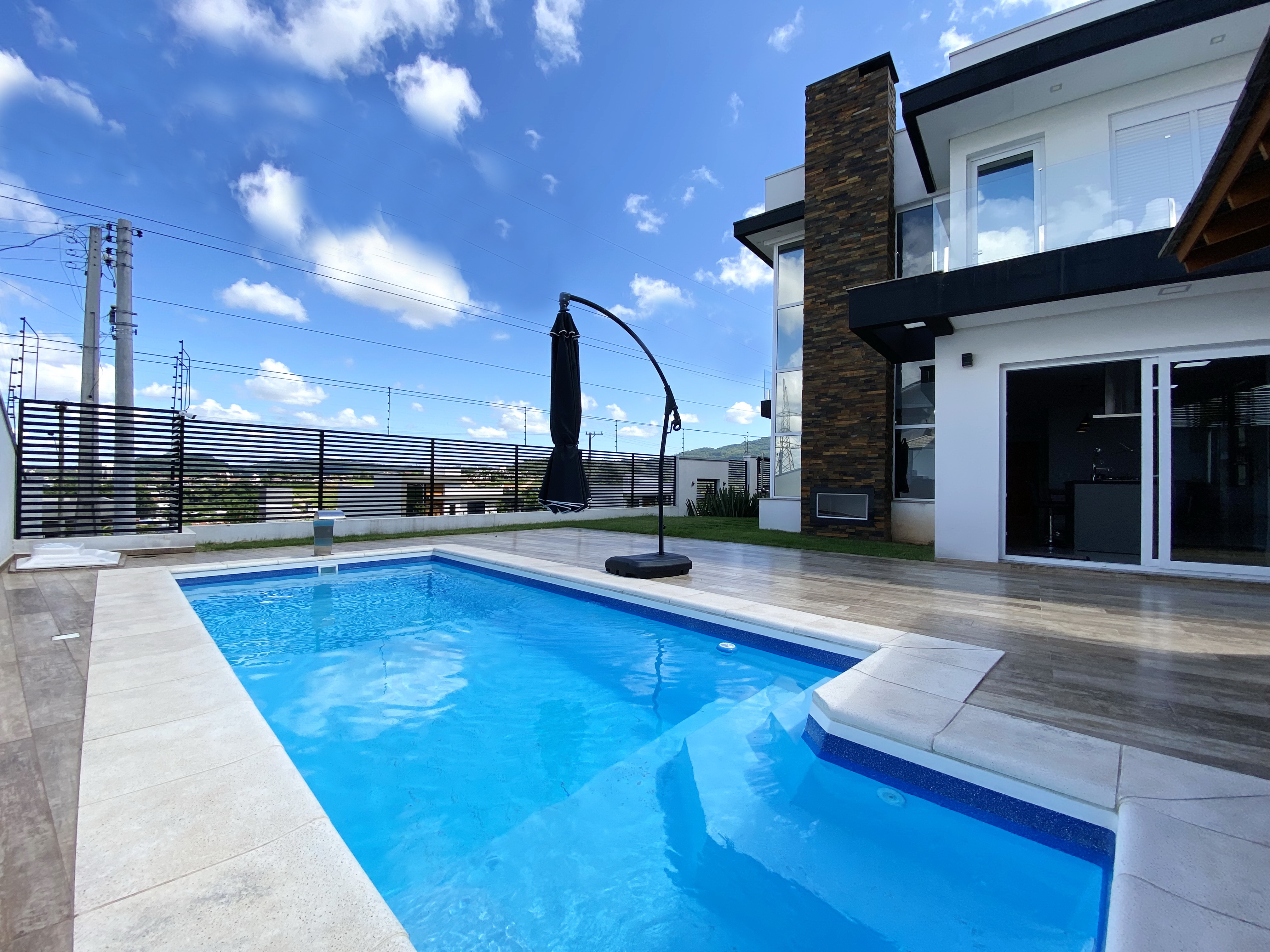 Ao todo são 4 dormitórios, sendo uma no primeiro piso e outros 3 no piso superior. Uma suíte máster com hidromassagem, closet e ampla sacada externa. Ambientes sociais integrados e finamente mobiliado, com estar com lareira, pé direito duplo e abertura de vidro, possibilitando visibilidade e valorizando a luz solar. Piscina aquecida, quiosque e garagem para dois carros lado a lado.