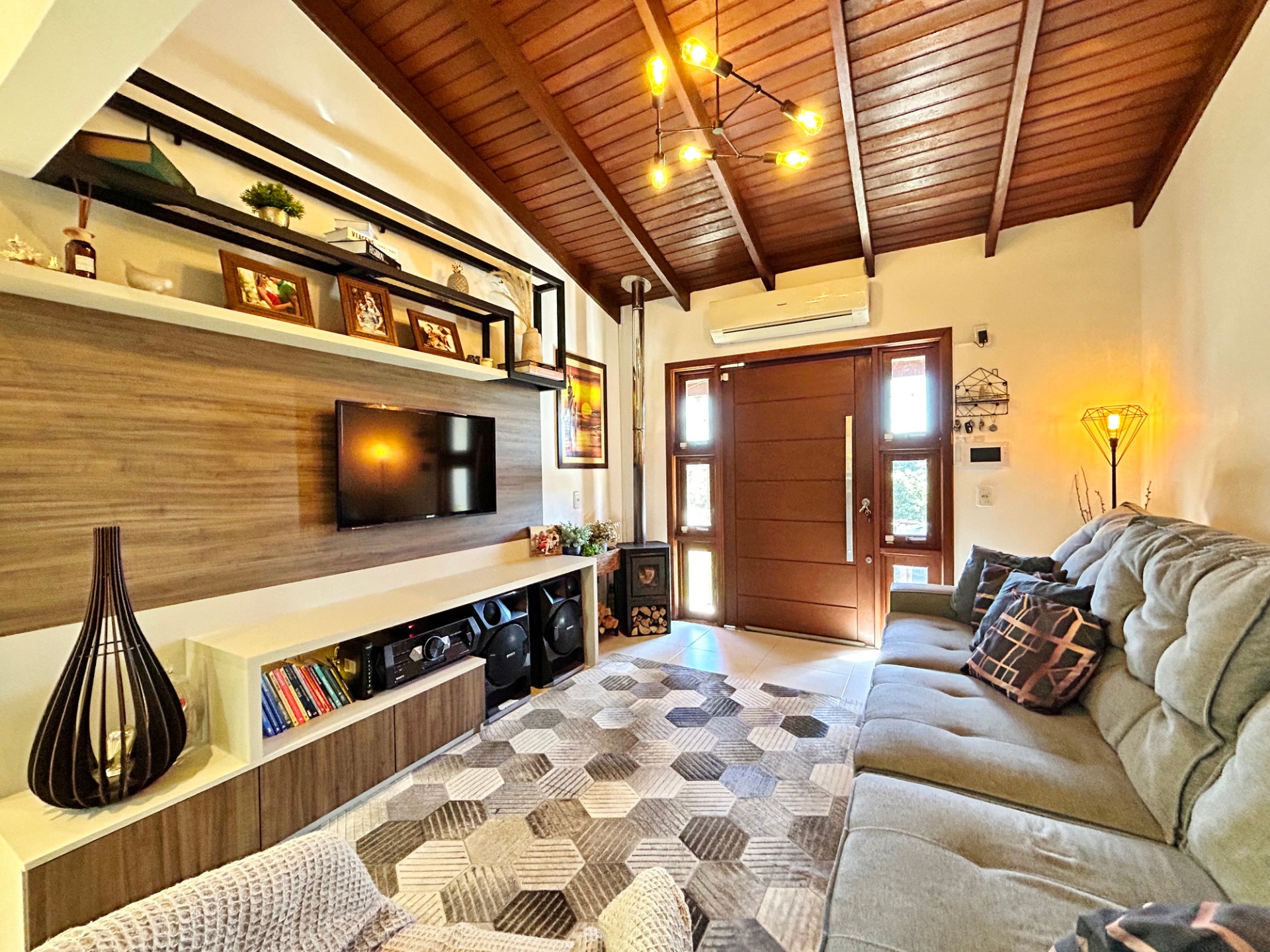 Sala de estar com lareira, cozinha em estilo americano, lavanderia separada.
