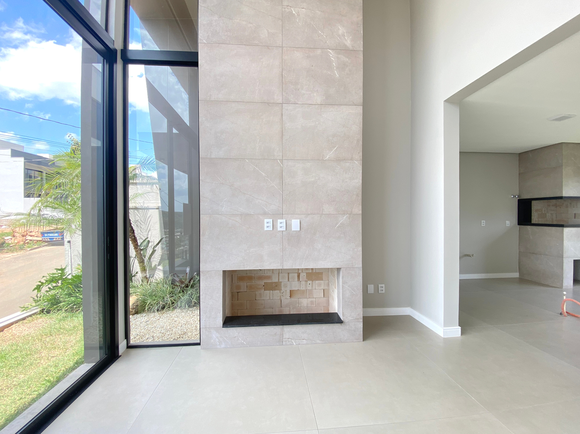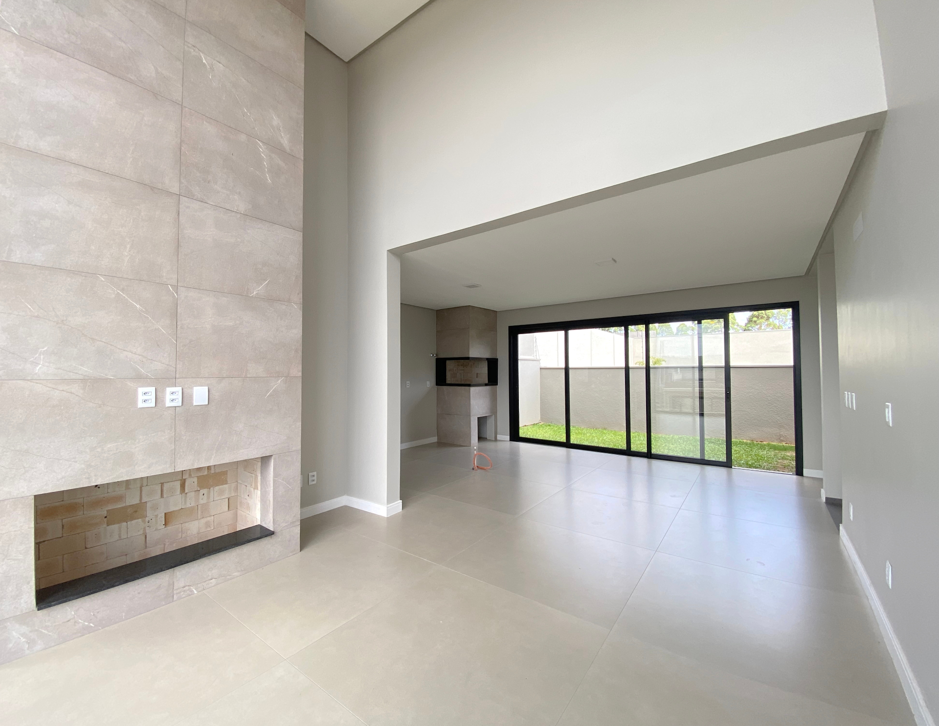Living com ambiente amplo, composto por uma sala de estar aconchegante, cozinha gourmet e sala de jantar, lareira e uma bela vista para um jardim frontal, a casa será entregue com piscina instalada.